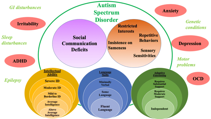 The diagnostic criteria for ASD are presented on a spectrum because the presentation varies significantly among individuals. This variability encompasses: