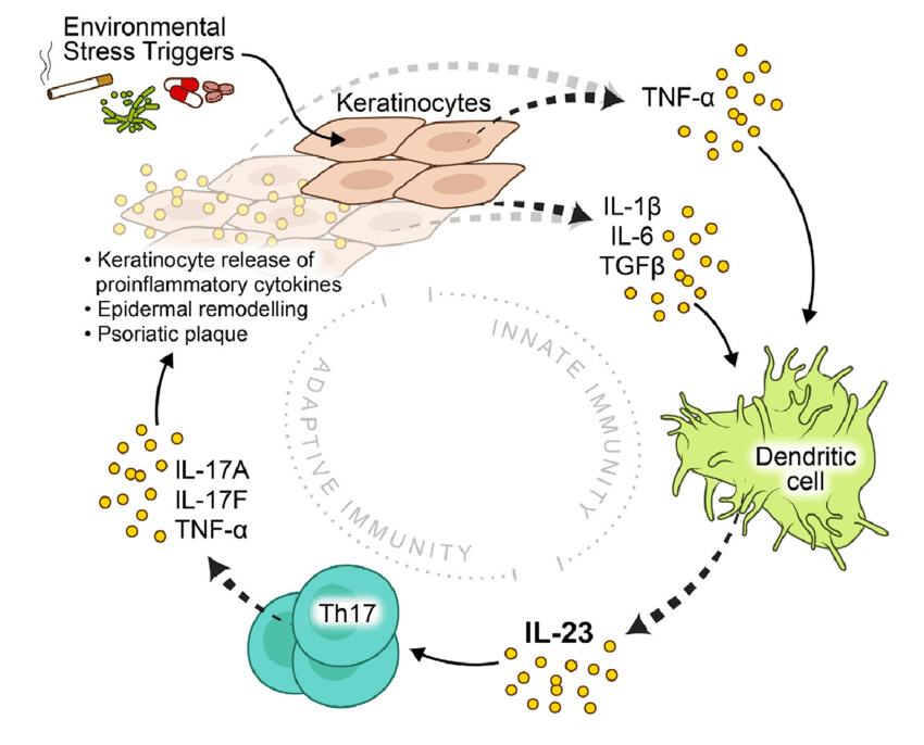 The constant bombardment of keratinocytes by these inflammatory cytokines (especially IL-17, IL-22, TNF-alpha) leads to the hallmark features of psoriatic plaques:
