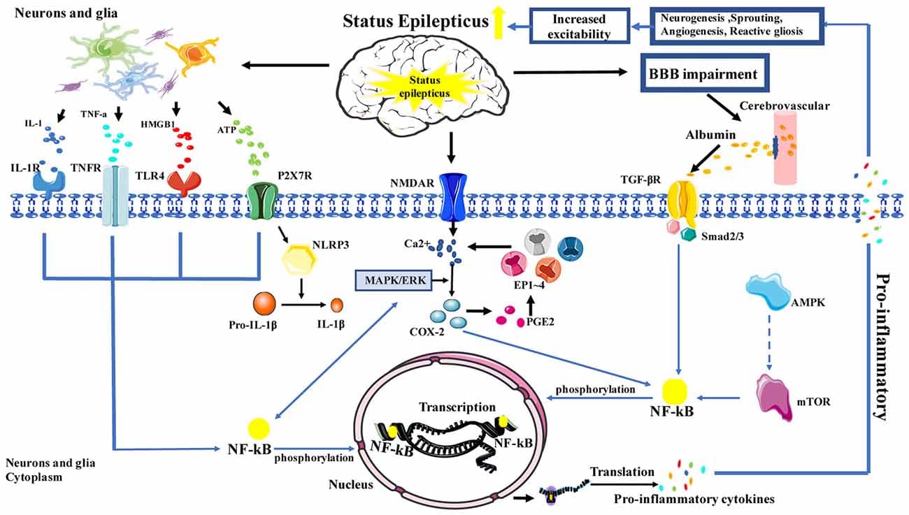 - Glutamate Hypersensitivity: Glutamate is the primary excitatory neurotransmitter. During SE, there is a sustained release of glutamate, which binds to N-methyl-D-aspartate (NMDA) and alpha-amino-3-hydroxy-5-methyl-4-isoxazolepropionic acid (AMPA) receptors, leading to excessive calcium and sodium influx into neurons.
