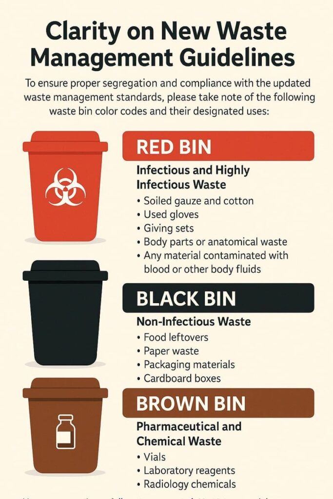 Hazardous (Infectious & toxic waste): Wards, Treatment Rooms, Dressing Rooms, OT ICU, Labour Room, Laboratory, Dialysis Room, CT Scan, Radio-imaging, etc.